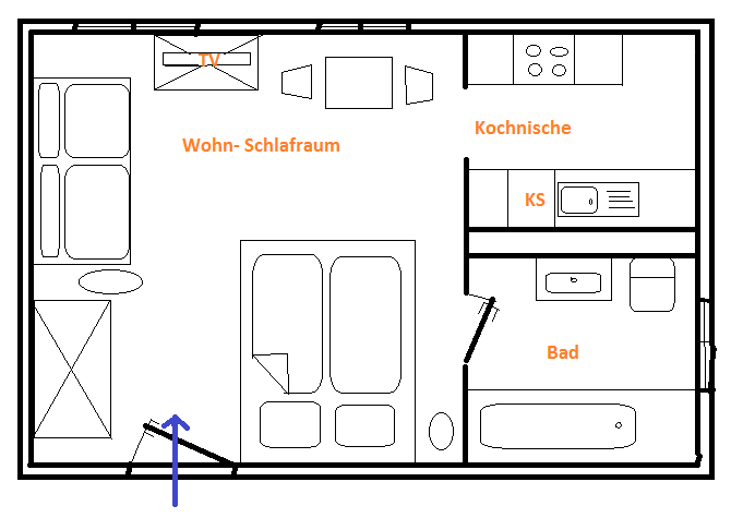 Apartment für 2-3 Personen, Bad mit Wanne/WC, Küche